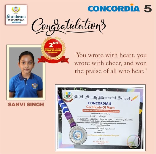Proud moment for Sunbeam School Indiranagar as Sanvi Singh secures 2nd position in the Rekindling Peace – Creative Writing Competition at